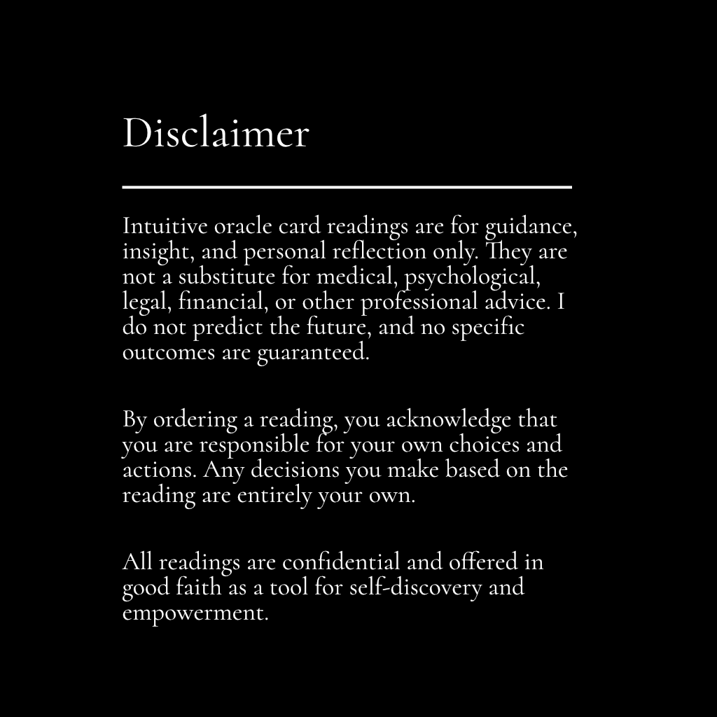 The length of your reading depends on the spread you choose and what Spirit wishes to share. Some messages come through quickly, while others unfold in more depth. I simply allow Spirit to guide the flow. No length time restriction but most readings fall between 10-25 minutes.